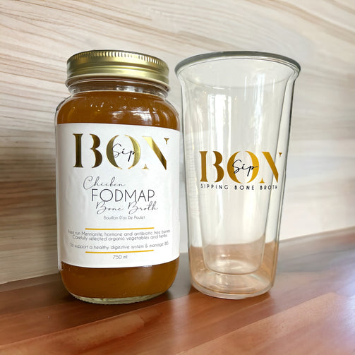 Crafted with care, our tasty Chicken FODMAP Bone Broth is slow-simmered to perfection using the bones of free-run Mennonite chickens, raised without hormones or antibiotics. We add a blend of carefully selected organic vegetables, herbs, and spices to create a gentle, FODMAP-friendly sipping broth that’s as soothing as it is flavorful.